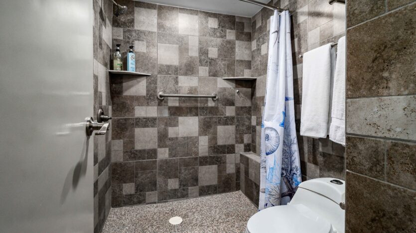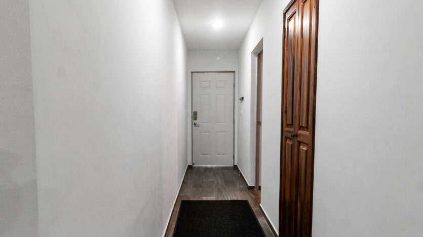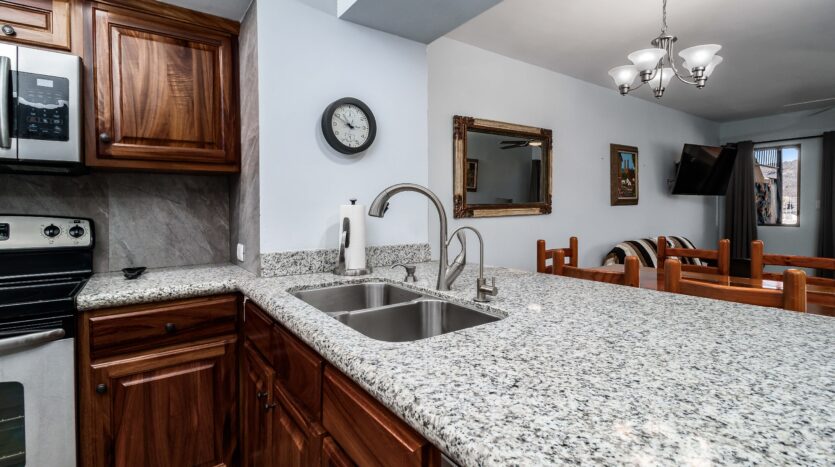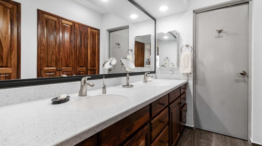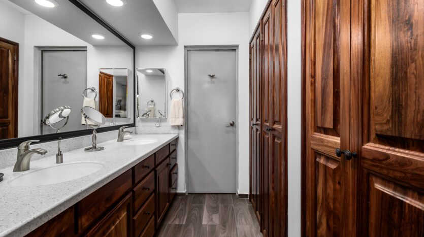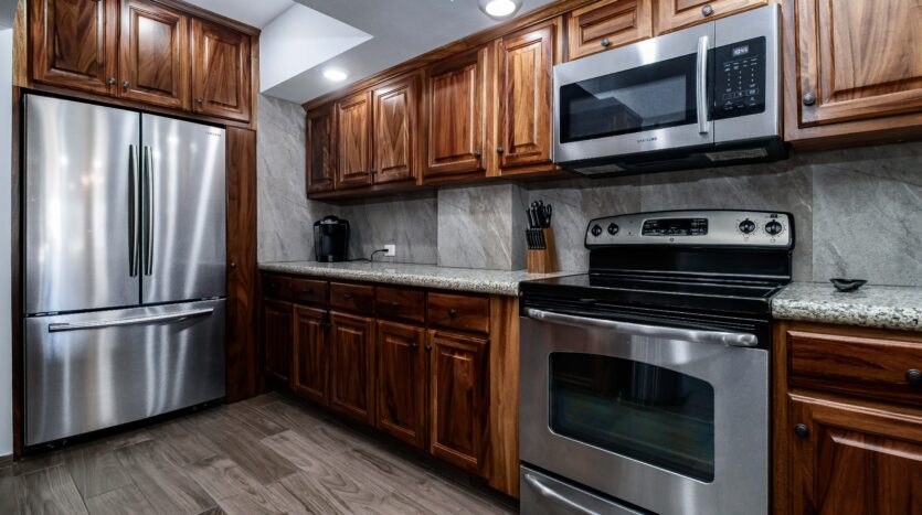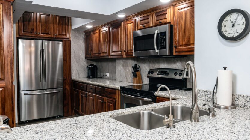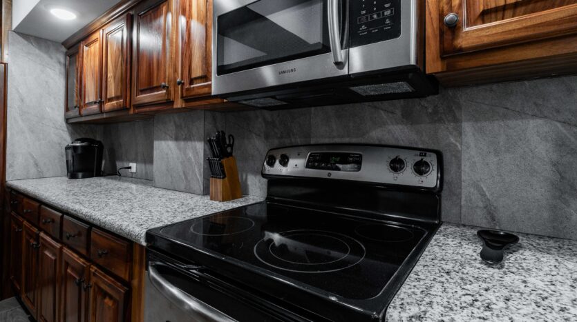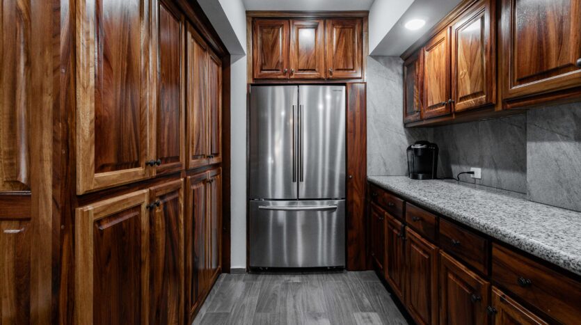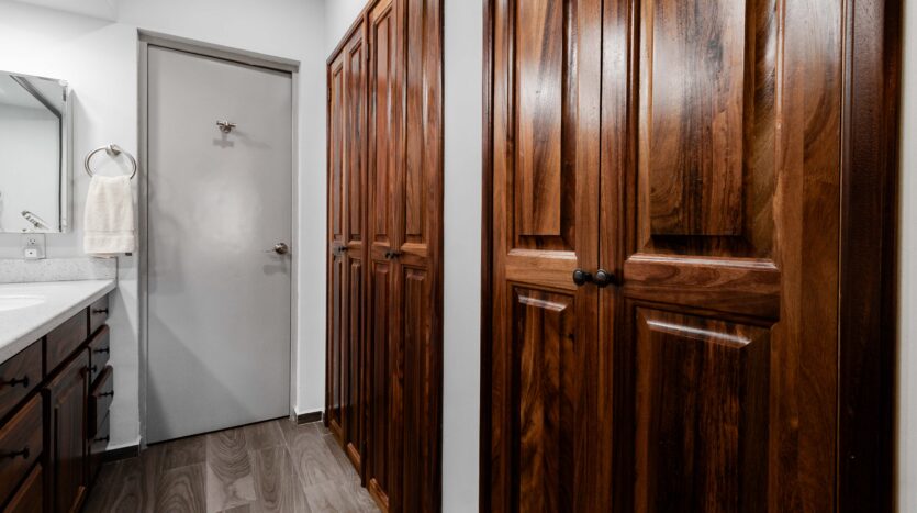 Situated on the second floor and accessible via elevator through the main hotel lobby, this turnkey unit features smooth, modern walls, rich Parota wood cabinetry and finishes throughout the kitchen and bathrooms, sleek granite countertops, and updated tile flooring that mimics the warmth of hardwood.