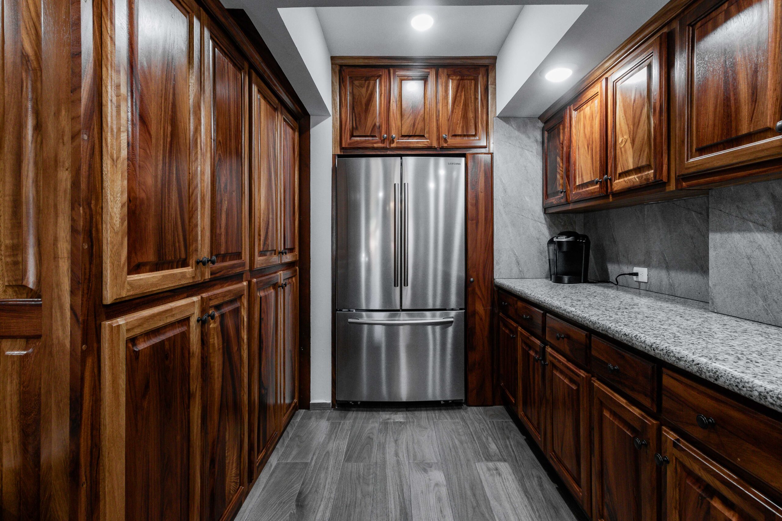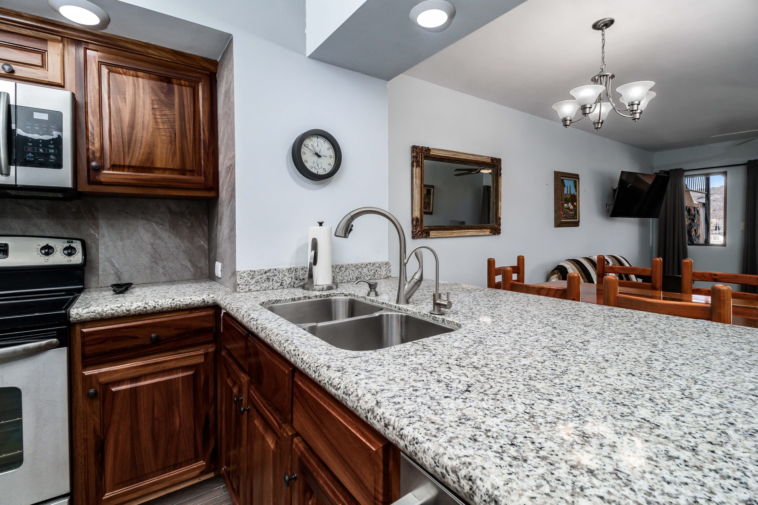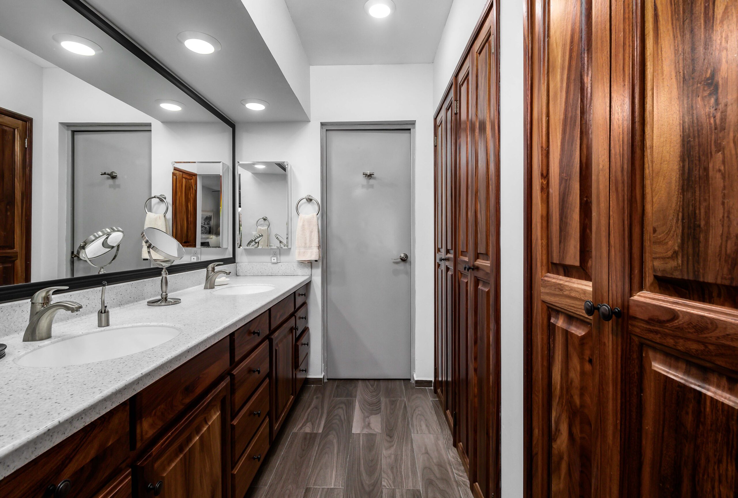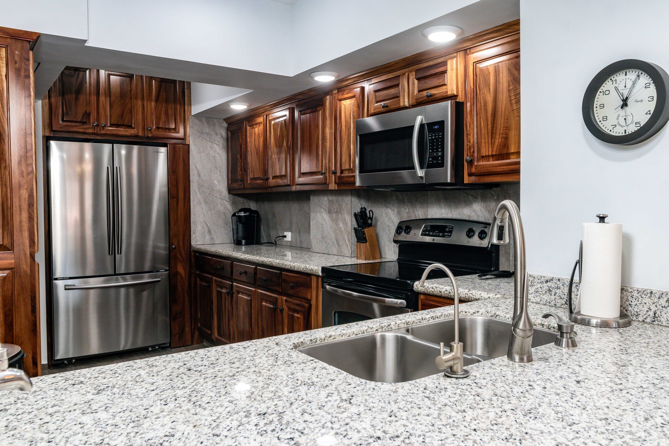 Situated on the second floor and accessible via elevator through the main hotel lobby, this turnkey unit features smooth, modern walls, rich Parota wood cabinetry and finishes throughout the kitchen and bathrooms, sleek granite countertops, and updated tile flooring that mimics the warmth of hardwood.